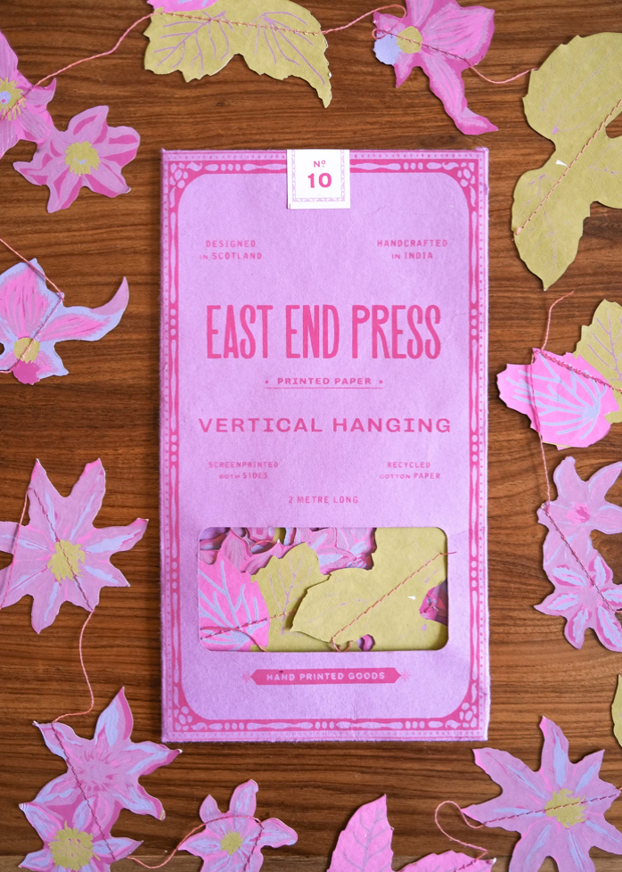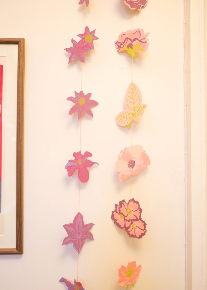 Floral paper shapes sewn along a strong cotton thread
