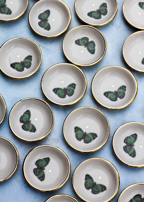 Each trinket dish is unique and feature a clear porcelain white glaze, highlighting a vintage botanical print of an emerald green butterfly flying towards a delicate gold heart.