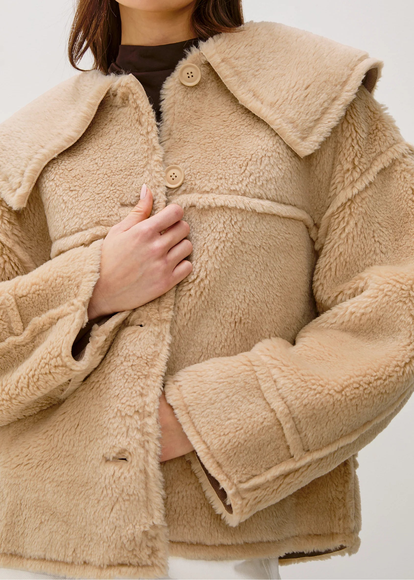 In cozy faux shearling, the Wesson Jacket presents a classic silhouette. It has a cropped, boxy fit and wide shawl collar, finished with button closures and seaming details throughout.