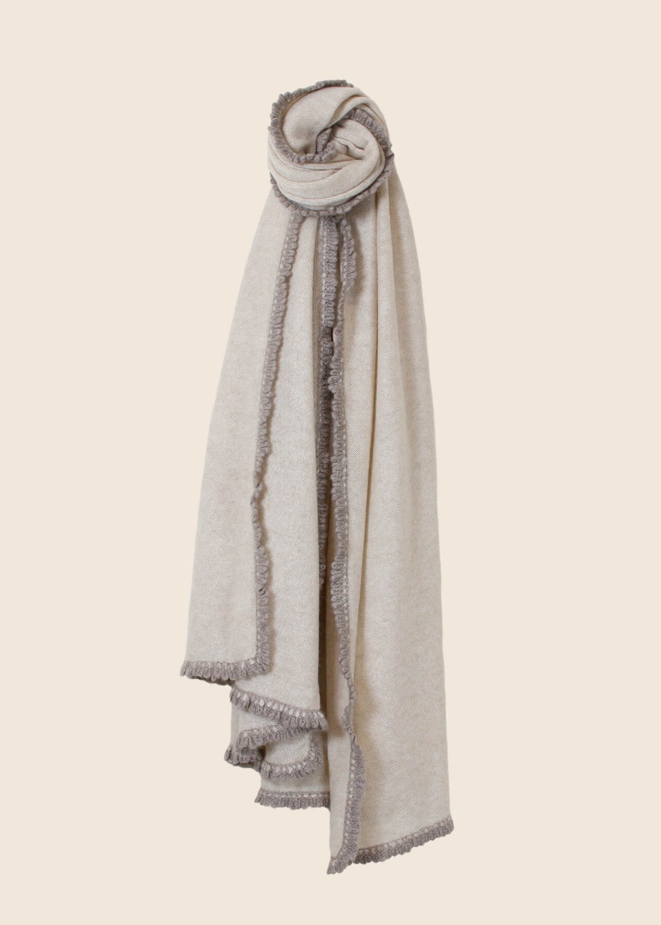 A warm yet not too heavy beige cashmere scarf with a delicate woven style. This piece is a favourite in the colder seasons. Crocheted fringes loop around the scarf giving it a snug style. Versatile and appropriate for all ages. Surround yourself with warmth in this superfine textile while elevating the effortless look.