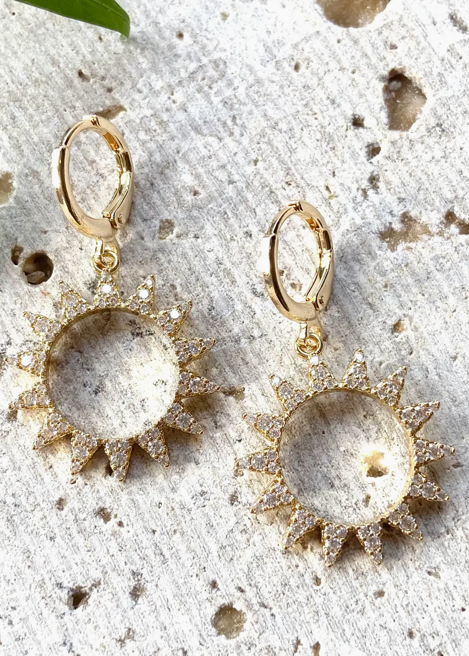 These micropave sun earrings have clear crystals on gold plate lever backs.