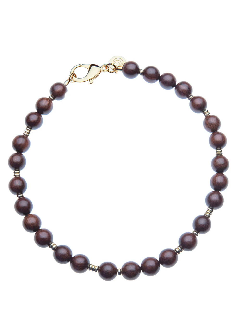 Wood beads make up the body of the necklace with gold-plated brass beads mixed in. Clasp is brass with 14k gold plating.