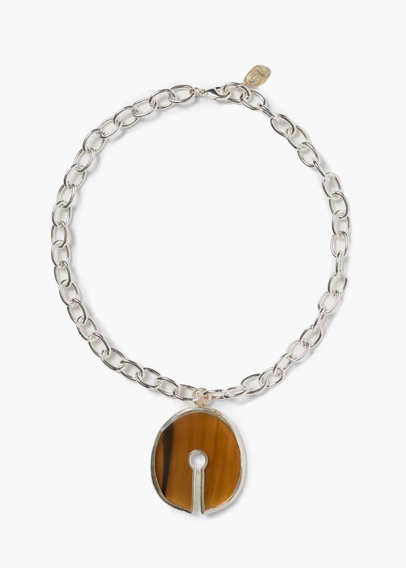 Minimalist yet bold, the Padlock Necklace Brown Horn features a carved horn pendant with an abstract keyhole motif on statement chain.