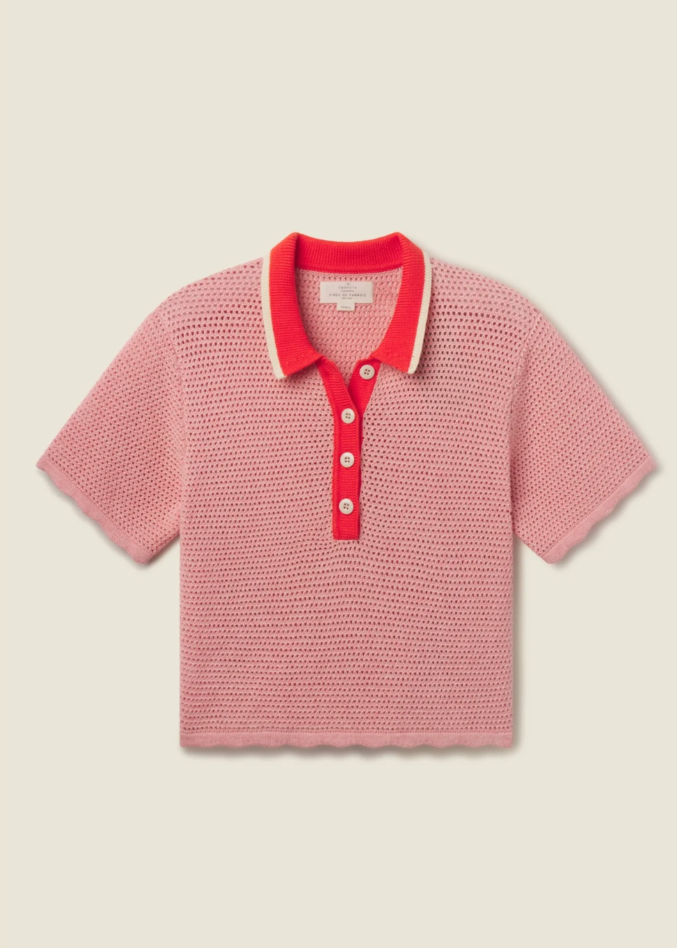 The Amalia Polo is a short-sleeve, loosely knit style inspired by Trovata's beloved Jules Sweater T-Shirt. Made in a lightweight, textured cotton, it features a contrast collar and buttoned placket, scalloped-trimmed hems, and a subtle stripe of color along the collar’s edge. Shown here in Rosado and made from cotton.