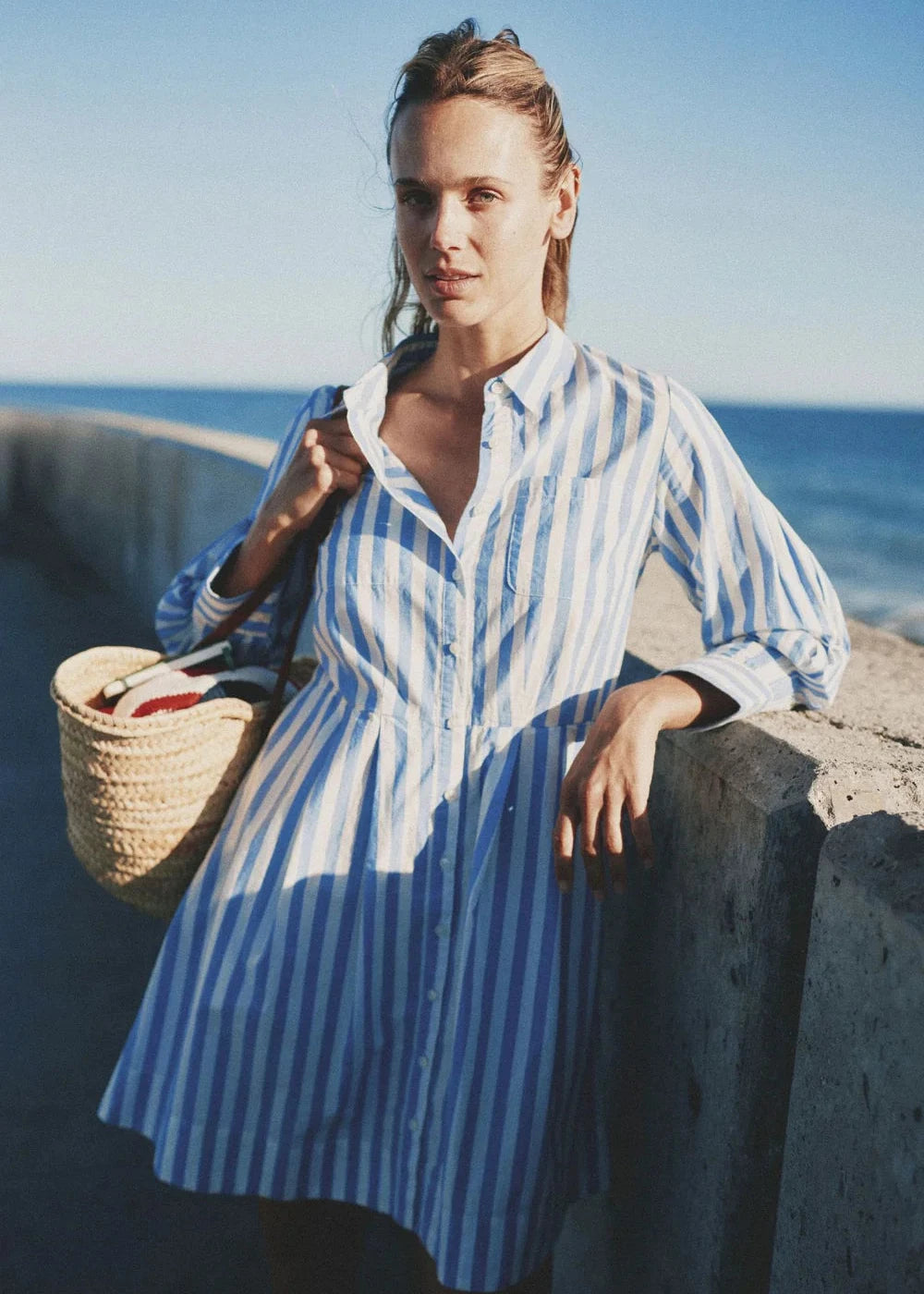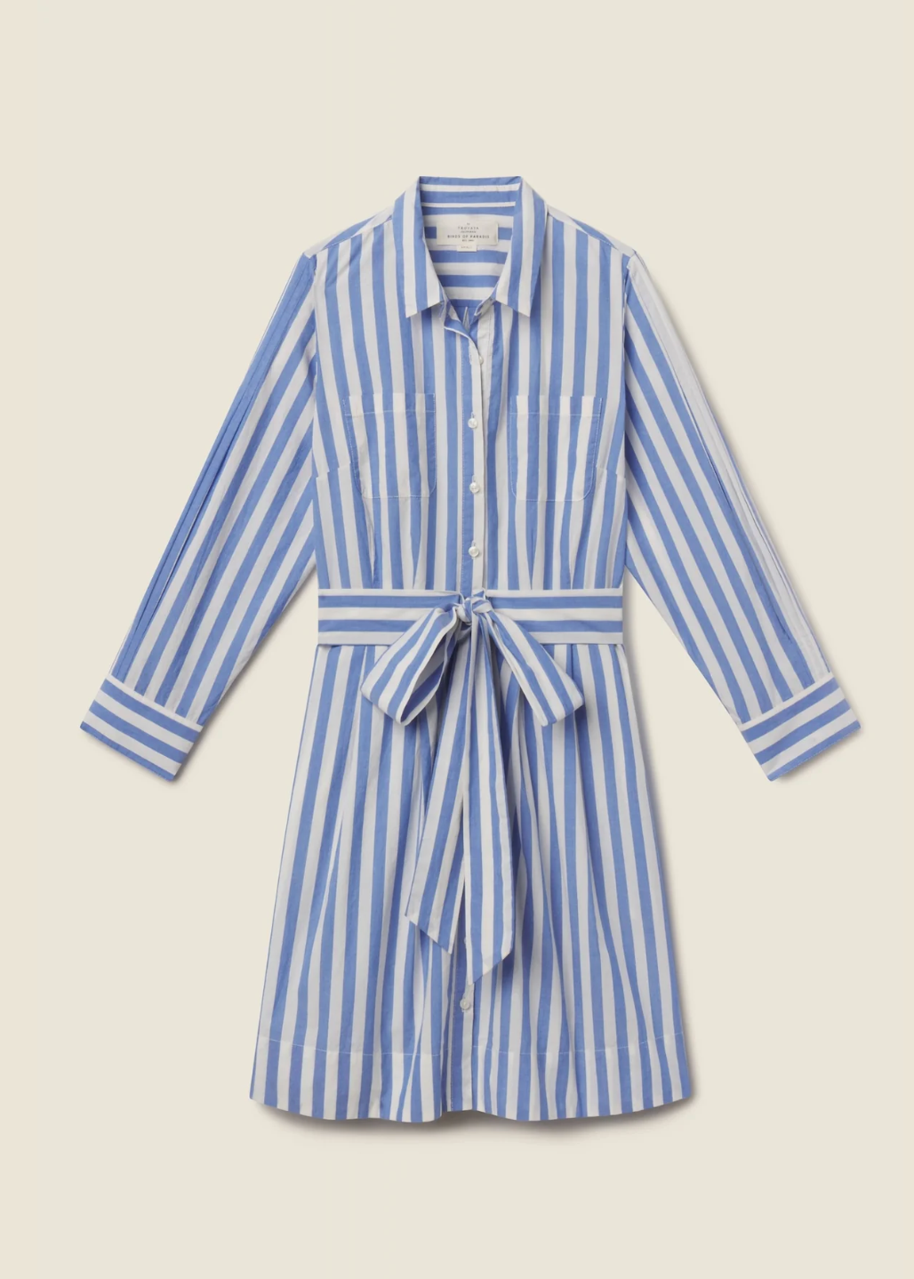 The Luli Dress is an easy shirtdress with classic tailoring and effortless shape. Designed with a traditional pointed collar and antique white buttons down the front, it features two front patch pockets and long sleeves with button cuffs. A removable self-fabric sash ties at the waist for a flattering, adjustable fit. Shown here in Volpi Lines and made from cotton poplin.