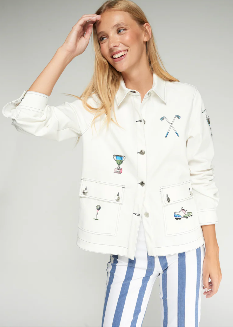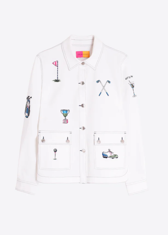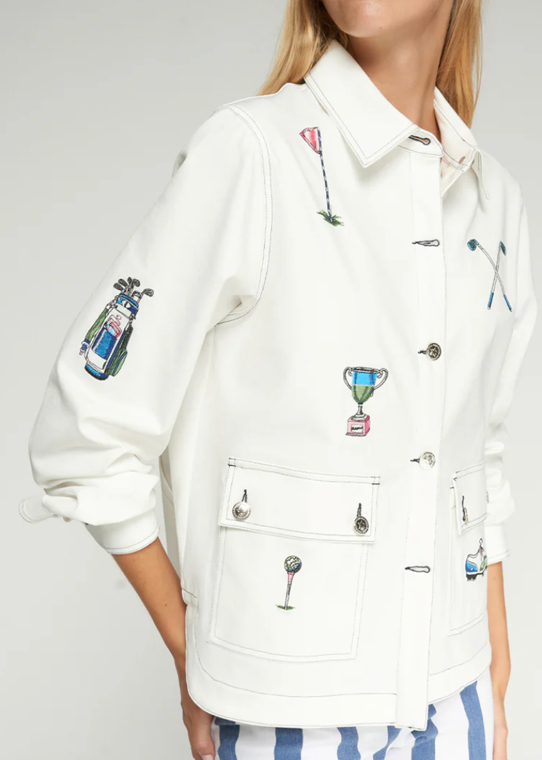 White jacket with metal button closure and shirt collar. Golf-inspired embroidery. Front flap pockets and contrasting stitching.