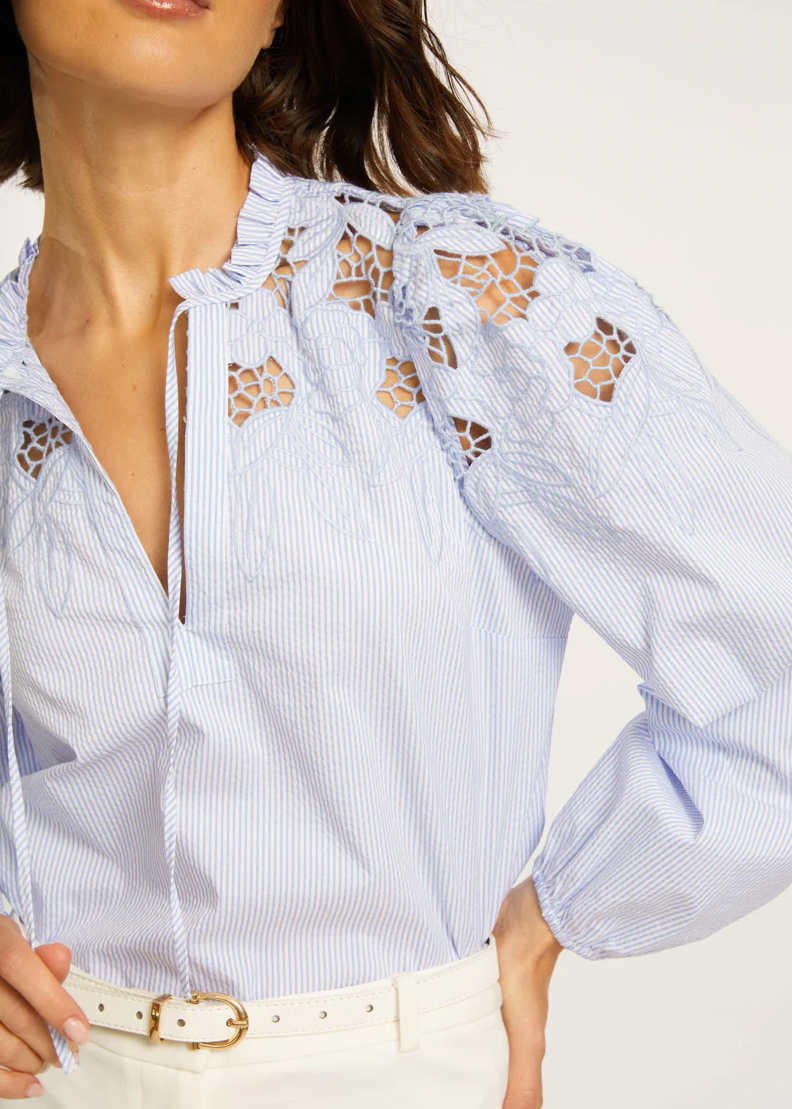 The Riana Top features a beautifully embroidered floral yoke at the shoulders, which adds an elegant touch that elevates the overall design. The long blouson sleeves provide both style and practicality for cooler days. Whether you're dressing it down with jeans for a casual outing or pairing it with a skirt for a more polished look, the Riana Top is versatile enough to suit any occasion.