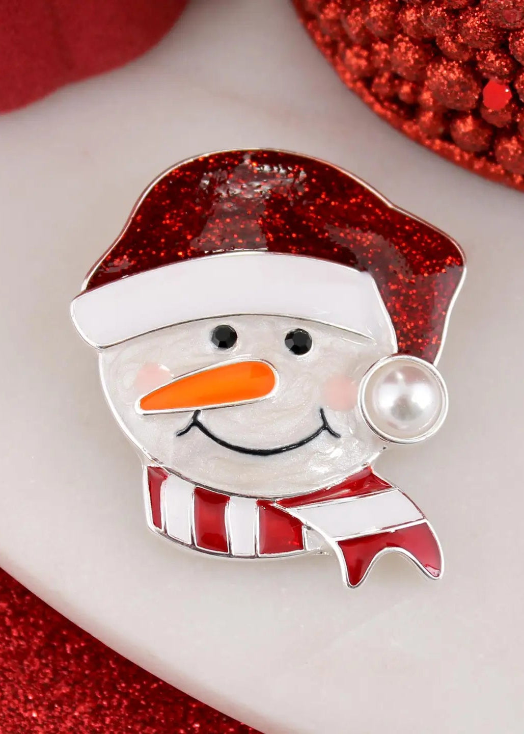 Silver tone magnetic clasp pin/pendant featuring an enamel snowman face wearing a red glitter enamel Santa hat with a pearl accent. Perfect for Winter and Christmas! Pin/pendant measures 2” in height.