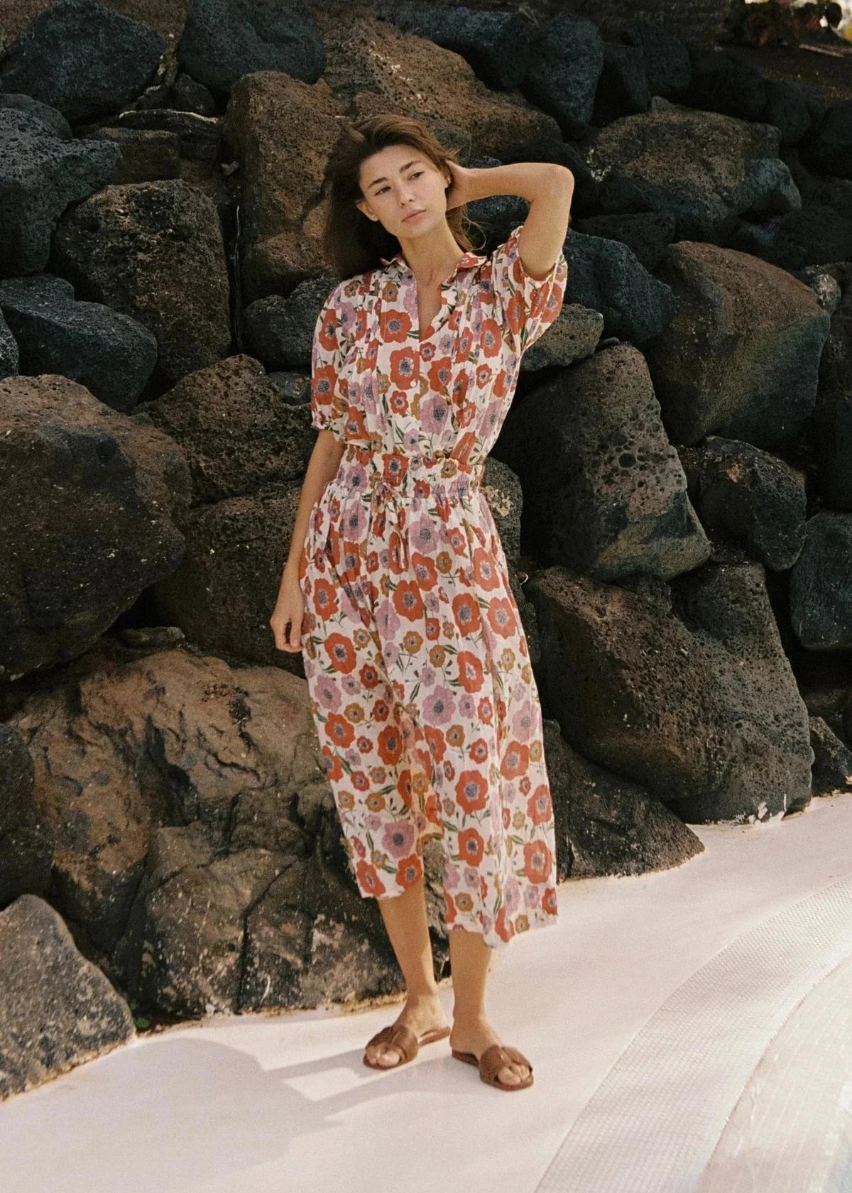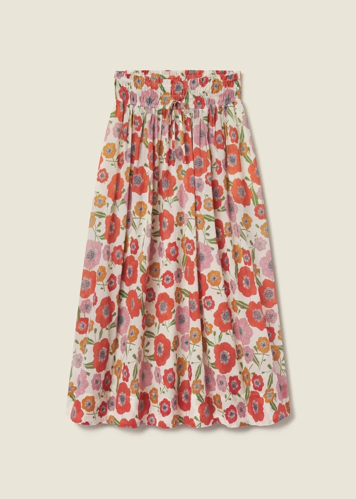 The Bianca Skirt is a billowy, midi-length style with a smocked elastic waistband and seamed gathers at the hips that release into a sweeping hemline. Finished with an adjustable self-fabric drawstring for a flexible fit and our signature side seam pockets. Shown here in Poppy Costa and made from cotton voile.