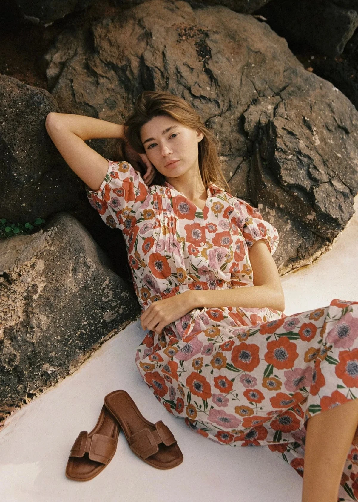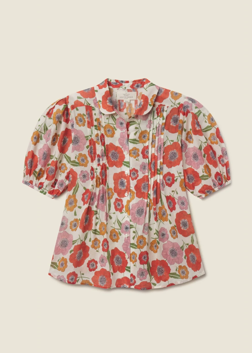 The Nadine Blouse is a short-puff sleeved blouse with a flattering curved hemline and petite pintucks that lend texture and hand crafted charm. Slightly cropped length keeps this blouse airy and whimsical. Shown here in Poppy Costa and made from cotton voile.